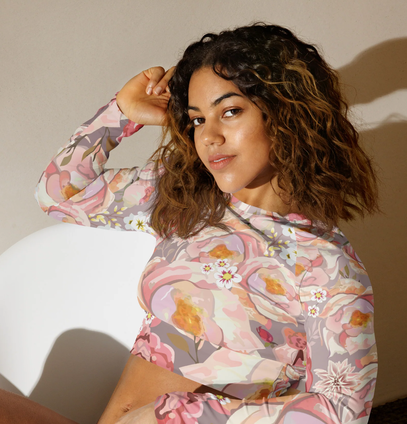 This long-sleeve crop top is made of recycled polyester and elastane, making it an eco-friendly choice for swimming, sports, or athleisure outfits. The crop top has a tear-away care label and a wide, double-layered waistline band for a comfortable fit.